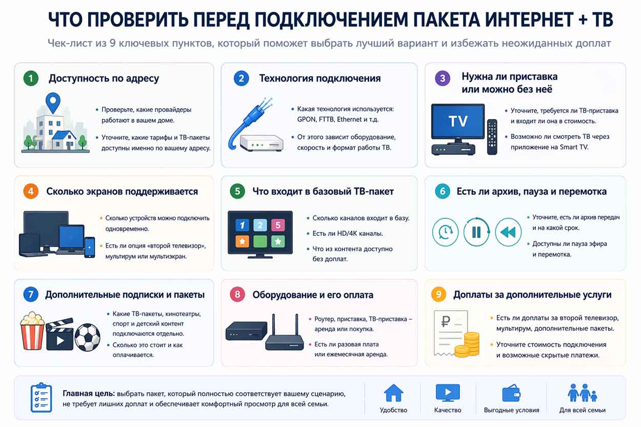 Перед подключением пакета интернет + ТВ важно проверить не только цену, но и сценарий просмотра, функции платформы, технологию и дополнительные расходы