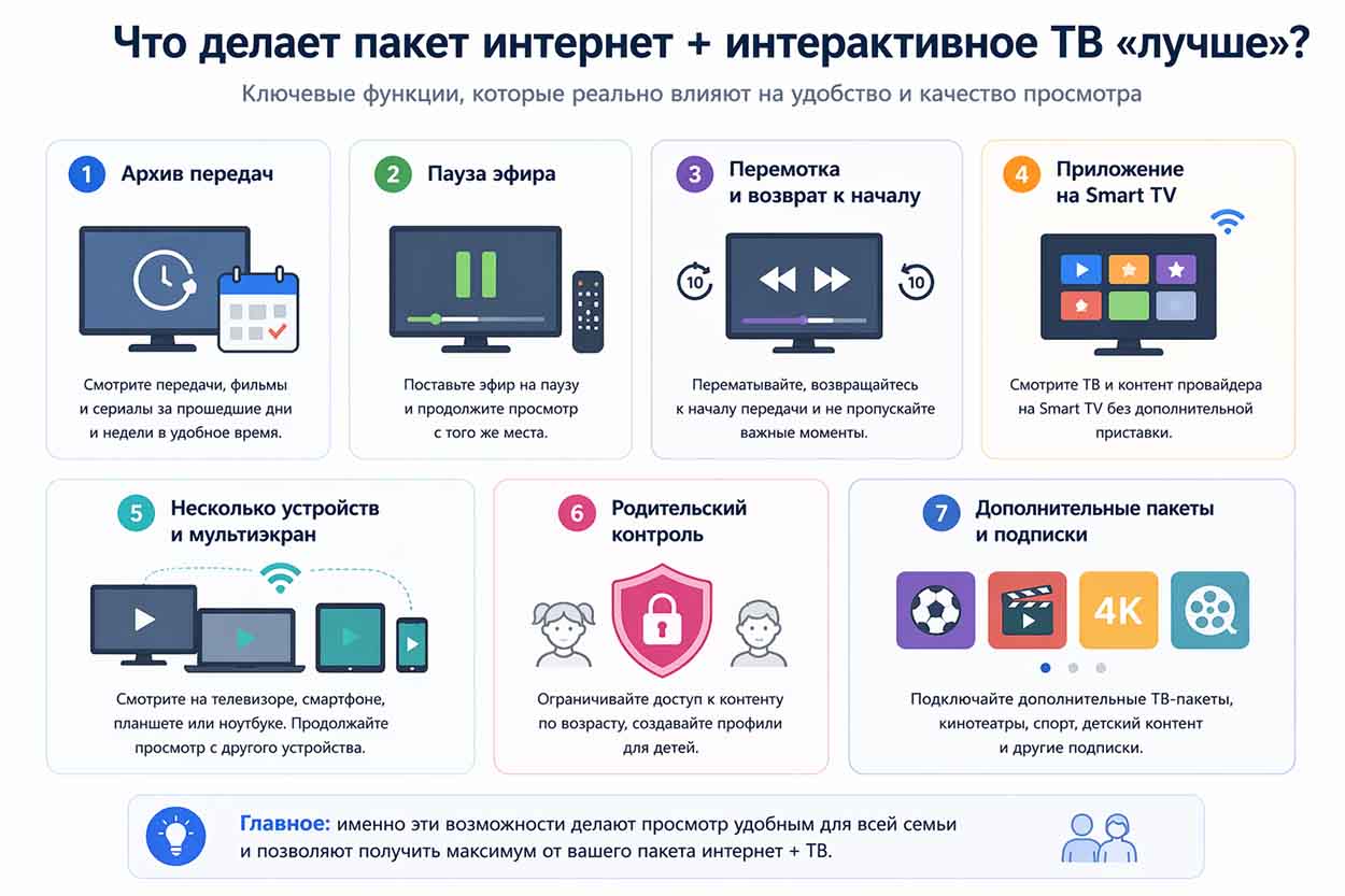 Пакет интернет + интерактивное ТВ особенно уместен там, где семье нужны не только фильмы и сериалы, но и телеканалы, архив передач, спортивные эфиры, детский контент, привычная ТВ-навигация и единая экосистема на нескольких устройствах. В таких сценариях пакет провайдера действительно сильнее, потому что собирает в одной точке и интернет, и ТВ-платформу, и оборудование, и дополнительные подписки.