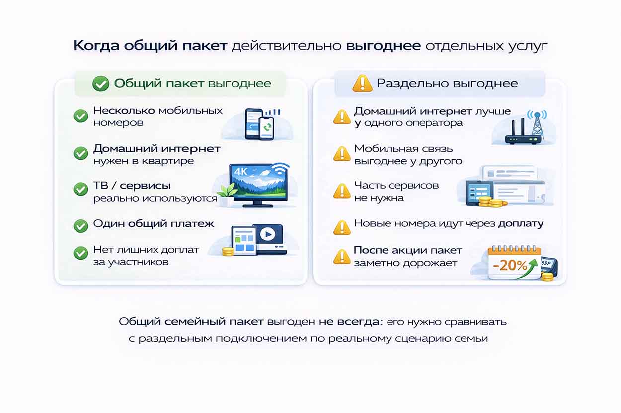 Общий пакет нельзя считать универсальным решением. Он требует отдельного сравнения с раздельным подключением, если домашний интернет уже подходит у одного провайдера, мобильная связь — у другого, а переход на одного оператора добавляет услуги, которыми семья не пользуется.
